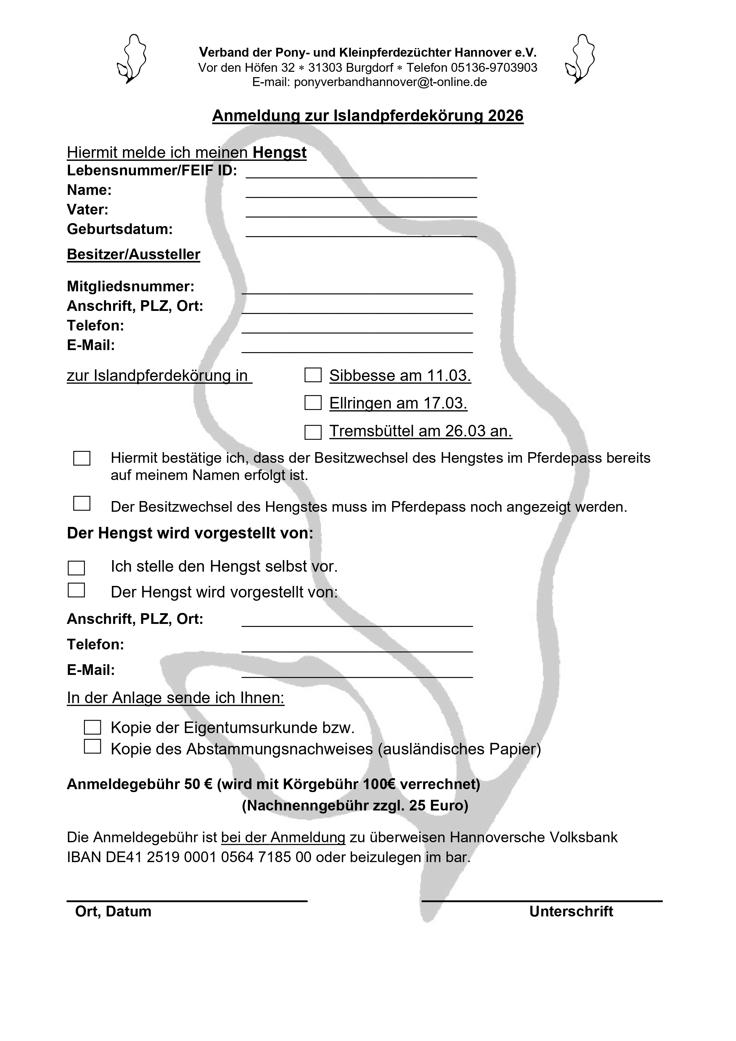 Die Besitzer, die ihre Hengste zur Körung vorstellen wollen, bitten wir die Teilnahme an der Körung in der Geschäftsstelle des Ponyverbandes anzumelden.