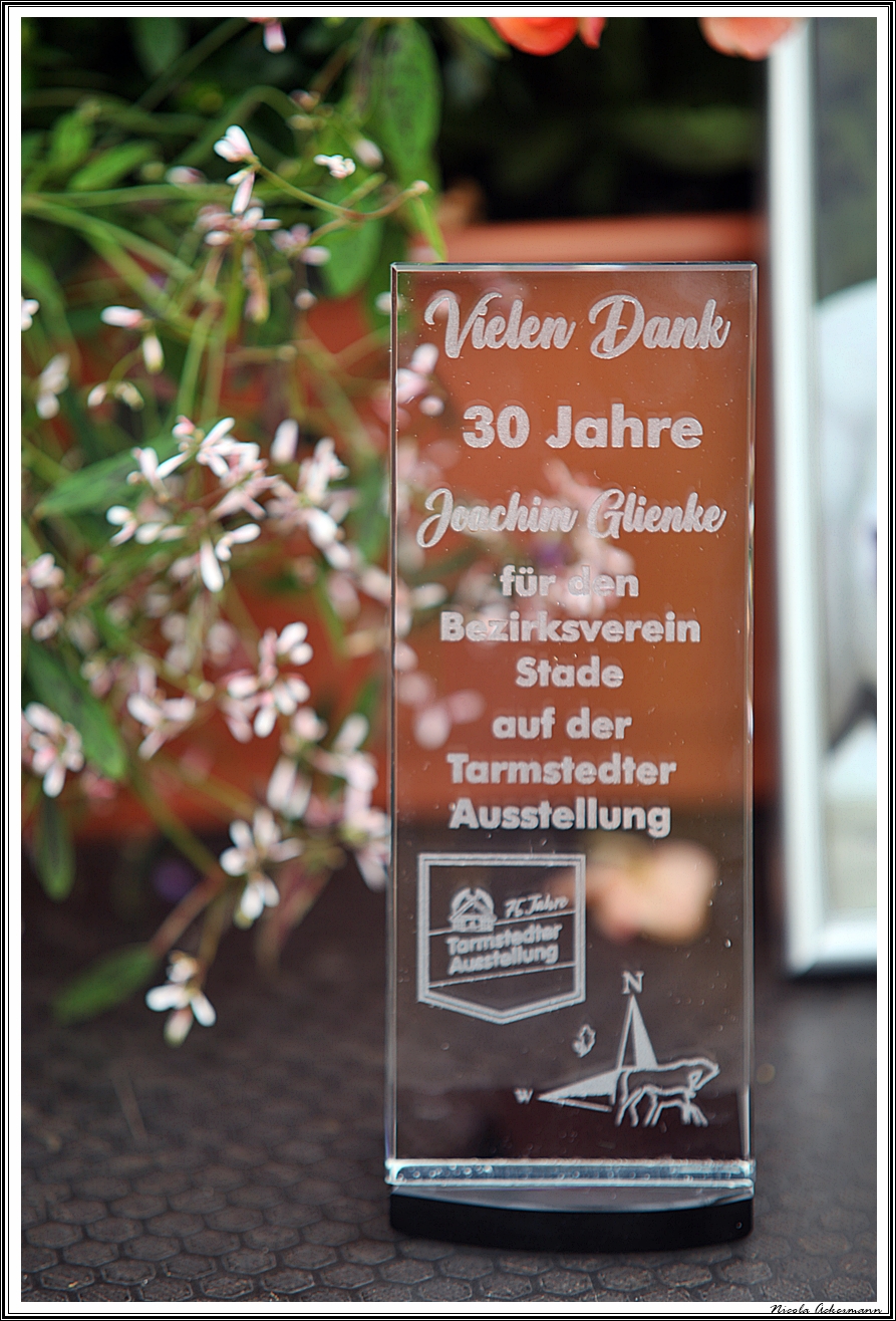 Im Rahmen der diesjährigen Tarmstedter Ausstellung ehrten wir unseren Ehrenvorsitzenden Joachim Glienke für seine Organisation und sein Engagement rund um unsere Präsenz auf dieser tollen Landwirtschaftlichen Ausstellung. Seit 1995 hat Joachim Glienke die Zügel fest in der Hand und neben unserem Stand auch tolle Schaubilder auf dem Gelände in Tarmstedt auf die Beine gestellt. Seine Nachfolge tritt Anika Bardenhagen an.